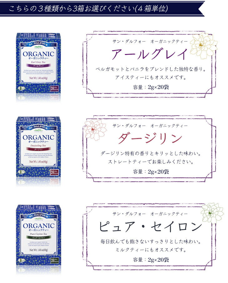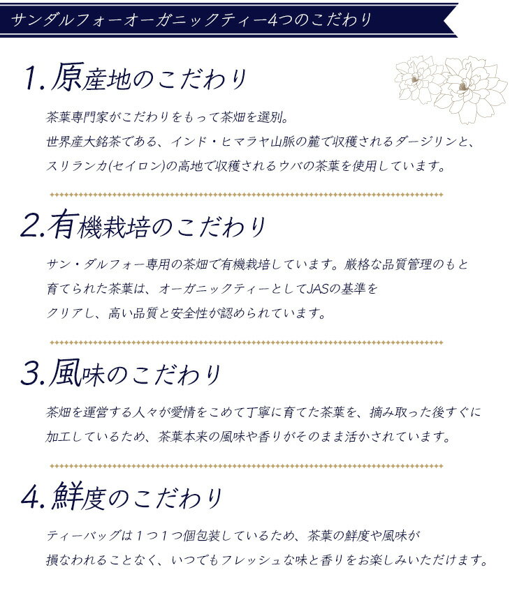 ≪7/19 20:00〜7/26 01:59≫200円OFFクーポン配布中♪【送料無料(一部地域を除く)】サンダルフォー オーガニックティーバッグ 20P選べる6箱セット セイロン ダージリン アールグレイ ※沖縄県¥1620/北海道¥1080/東北¥150の別途送料がかかります。 商品価格:2,646円 レビュー件数:0件 レビュー平均:0(5点満点) 楽天で購入 トップページへ