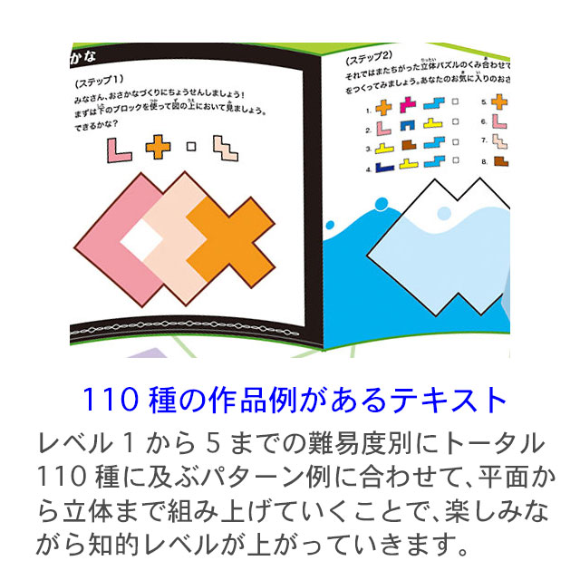 110種の作品例があるテキスト レベル1から5までの難易度別にトータル110種に及ぶパターン例に合わせて、平面から立体まで組み上げていくことで、楽しみながら知的レベルが上がっていきます。
