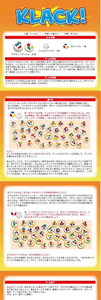 無地の絵柄だけのシンボルサイコロと色だけが描かれたサイコロ2つを振り、並べられたカラフルなマグネットディスクの中から、シンボルサイコロの絵と色サイコロが一致する絵柄のディスクを探すドイツ・アミーゴ社のゲームです。