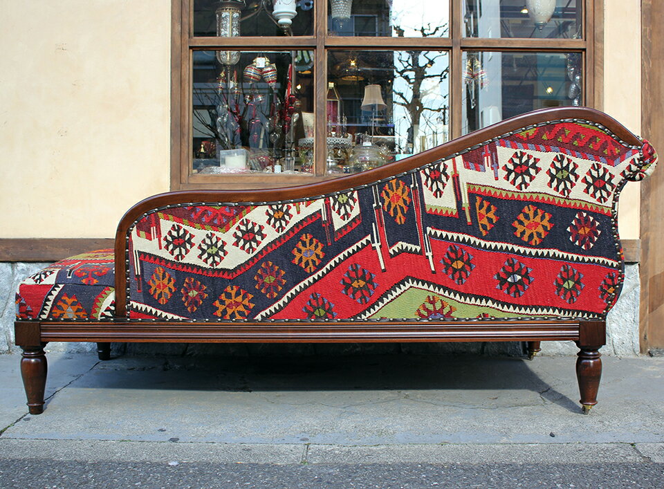 座面から背もたれの裏側まで、すべてキリムで覆われ贅沢なつくりです。