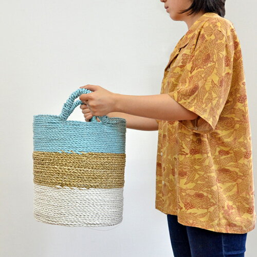 シーグラスバスケット 持ち手つき H33cm Bタイプカゴ 収納 入れ物 取って付き 天然海藻 手編み ハンドメイド ブルー ターコイズブルー 植木鉢入れ 小物入れ ランドリー バスケット ナチュラル アジアン ハワイアン かわいい おしゃれ きれい bas-0265-b